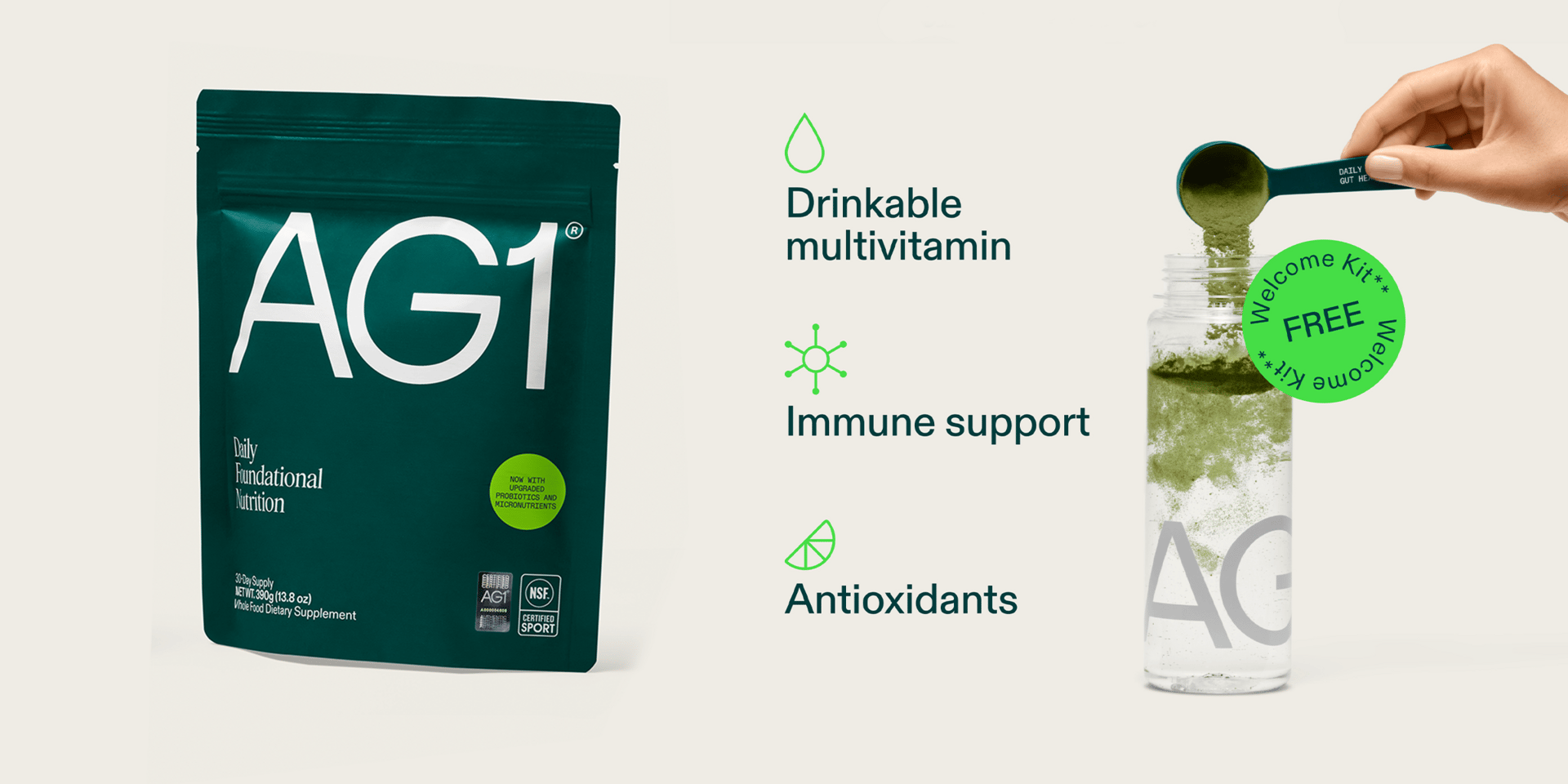 Click HERE to get a FREE AG1 Welcome Kit including an AG1 flavor sample pack, canister and shaker bottle with your first subscription.