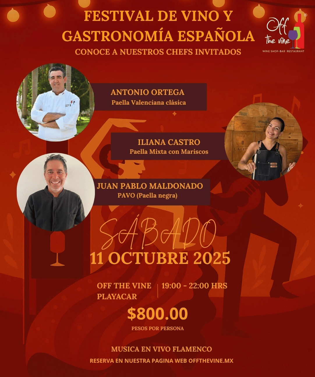 Off the Vine Playacar invites you to an unforgettable evening celebrating the flavors, aromas, and traditions of Spain. Enjoy a guided tasting through Spain’s most renowned wine regions, perfectly paired with authentic dishes and three distinctive paella creations prepared by guest chefs: